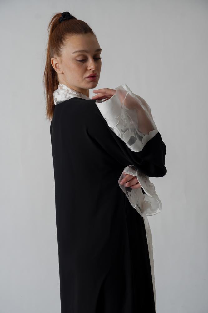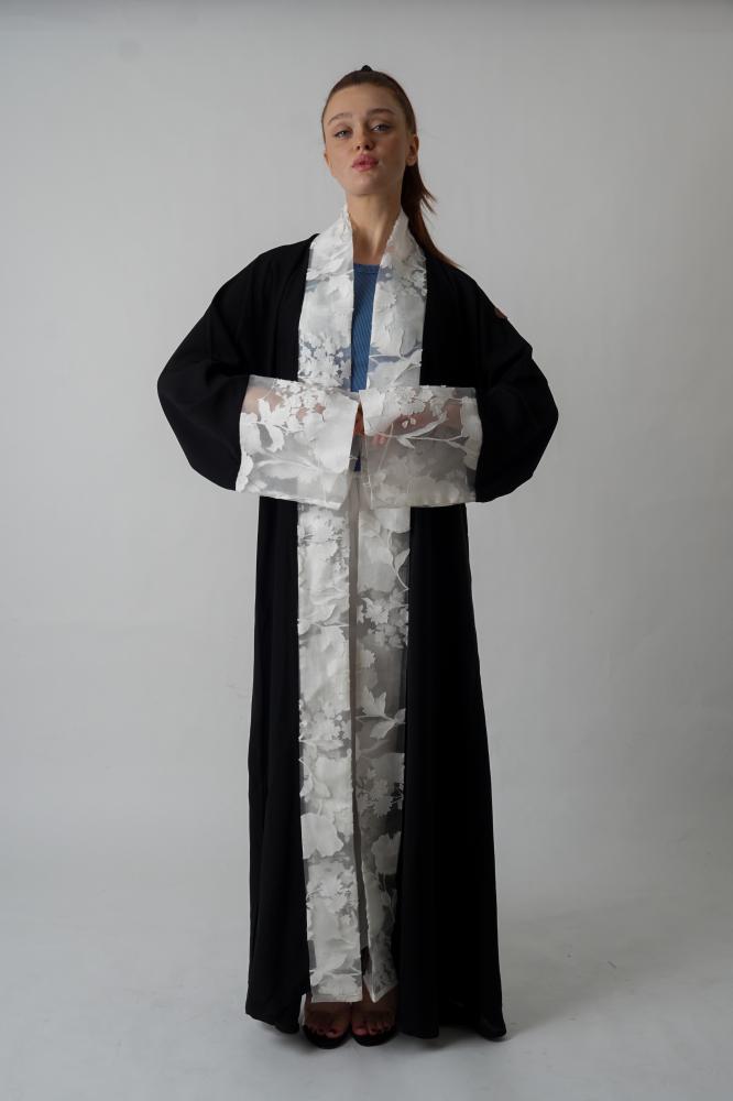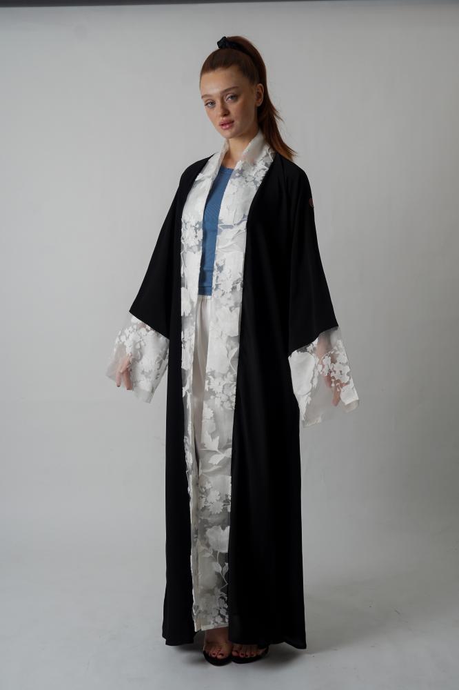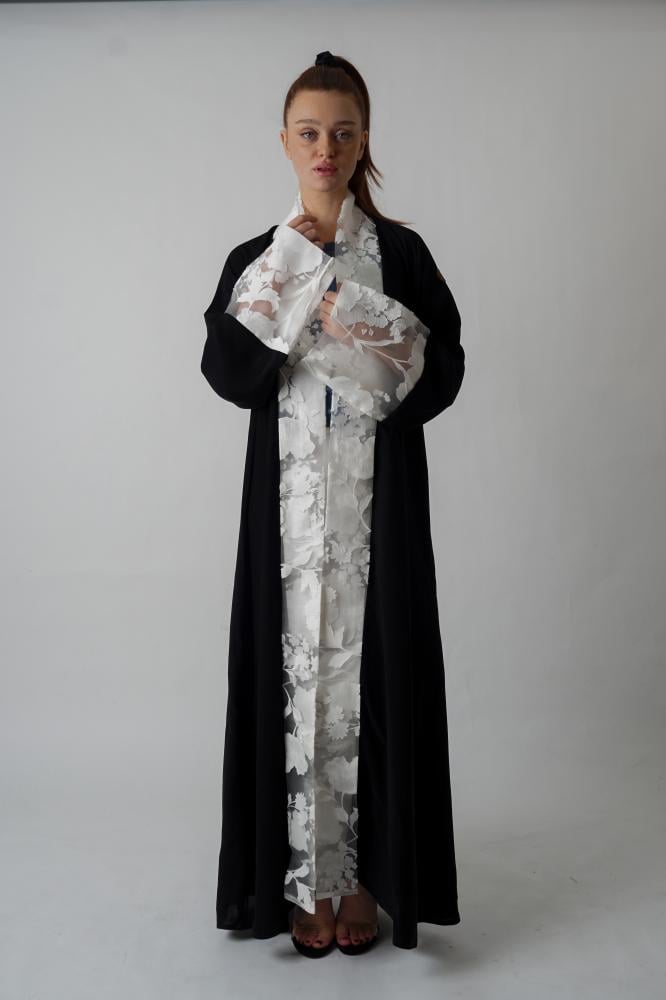 - ألوان متناسقة: تأتي العباءة بمزيج من الألوان البيضاء والشفافية والأسود، وجميعهم يمنحوكِ طلة هادئة ومتناسقة، والأبيض سيضفي سحرًا خاصًا على كل خطوة لكِ.