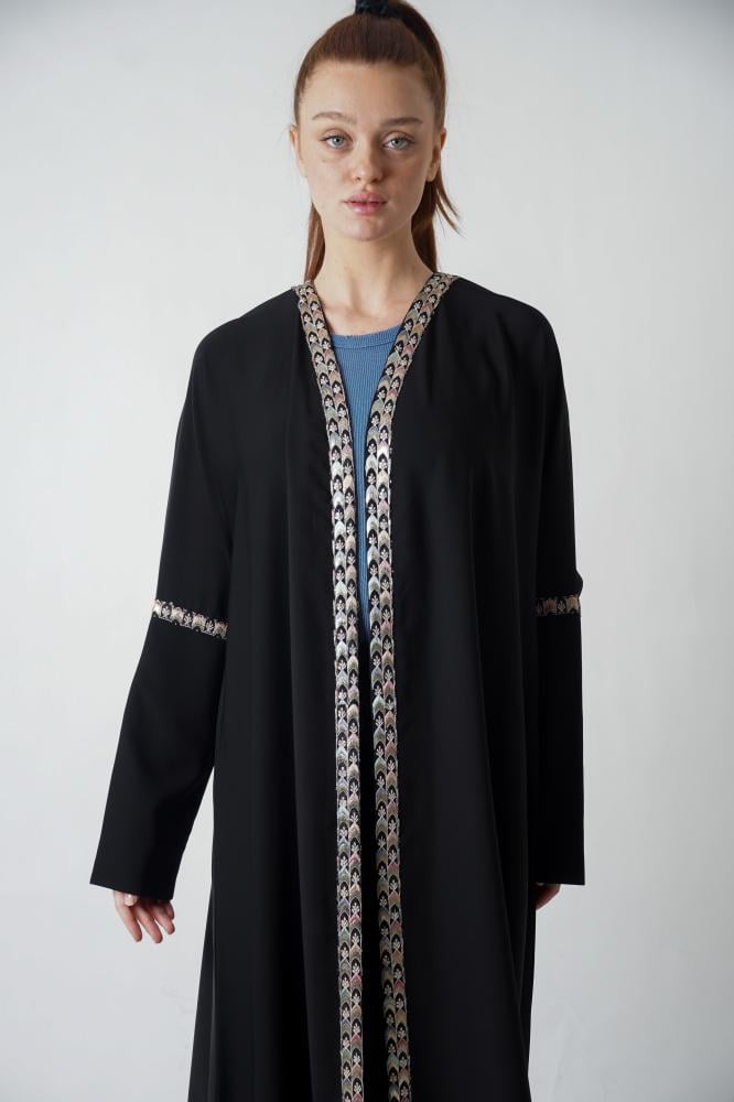 • تطريز فريد: تميز تصميم العباءة التطريز الملون على الحواف من الأمام والأكمام، وهذا يُضيف لمسة من الفخامة والتفرد ويعطي للعباءة مظهر أنيق وساحر.